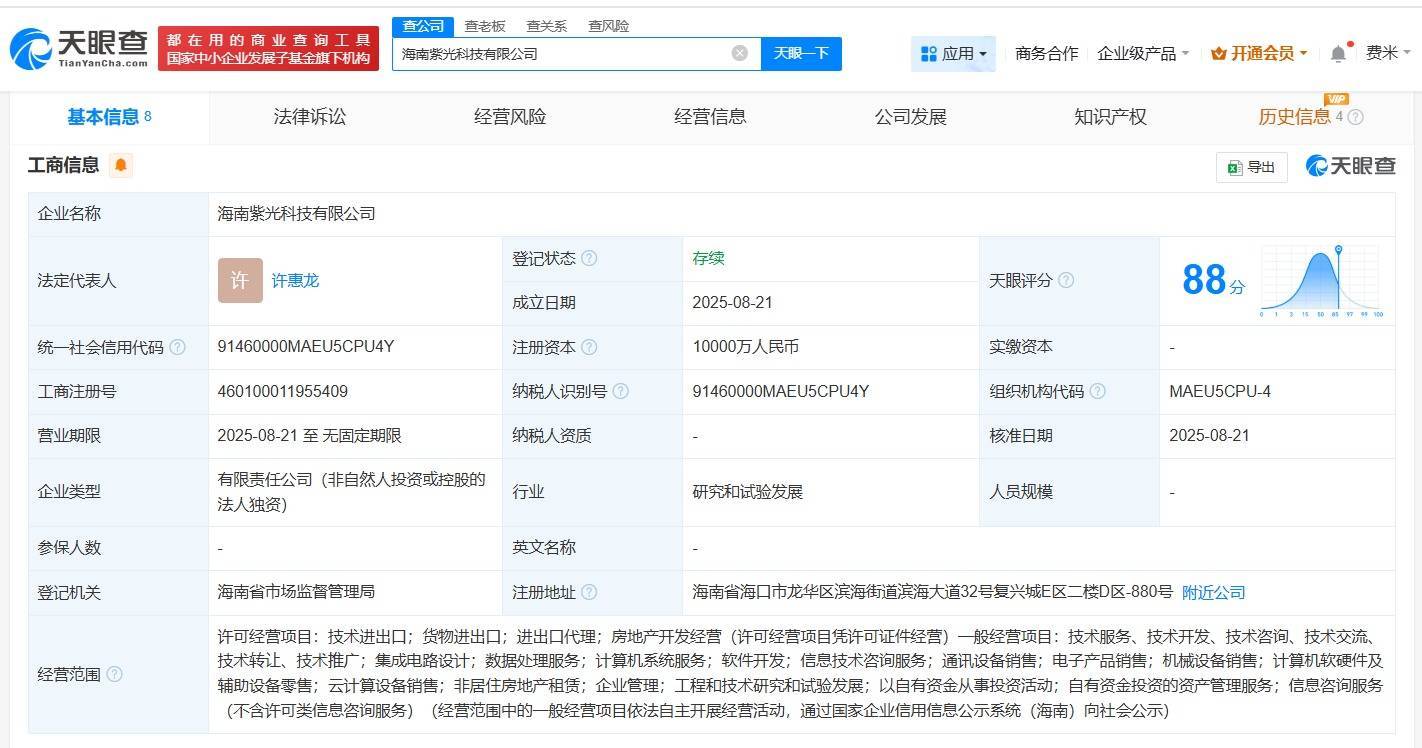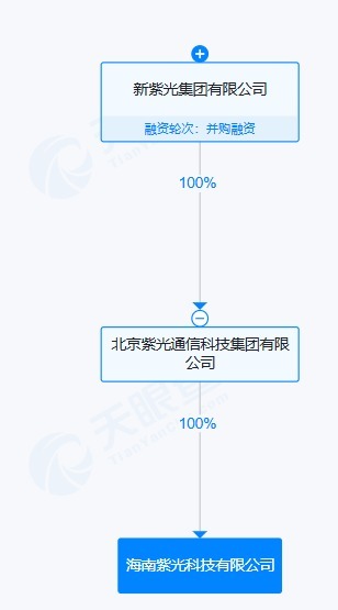 天眼查工商信息显示,近日,海南紫光科技有限公司成立,法定代表人为许惠龙,注册资本1亿人民币,经营范围包括集成电路设计、数据处理服务、计算机系统服务等。股权全景穿透图显示,该公司由新紫光集团旗下北京紫光通信科技集团有限公司全资持股。