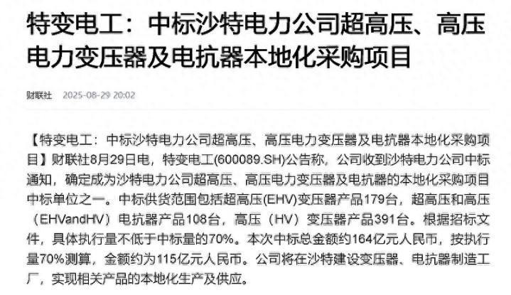 特变电工中标沙特电力公司约164亿元设备订单,执行期7年(最低执行量70%,约115亿元)。其核心意义在于: